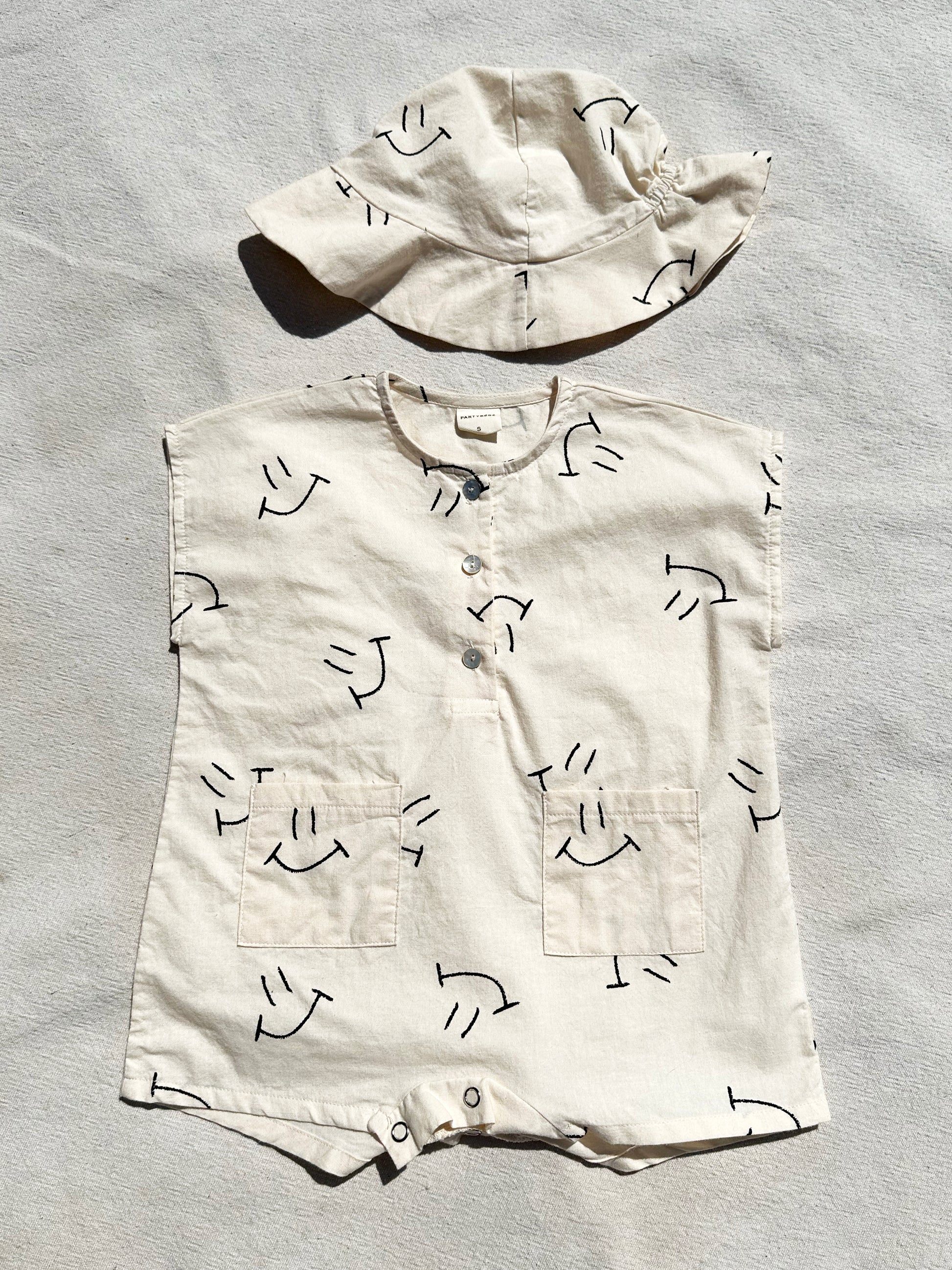 The Smiley Onesie in Vintage White is a sleeveless onesie that comes with a matching bucket style hat. Features a 3 button closure and patched front pockets. Super soft hand feel!